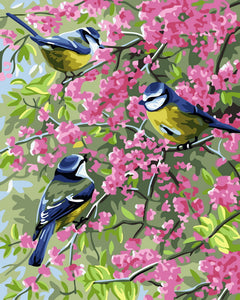Tres pájaros en ramas floridas