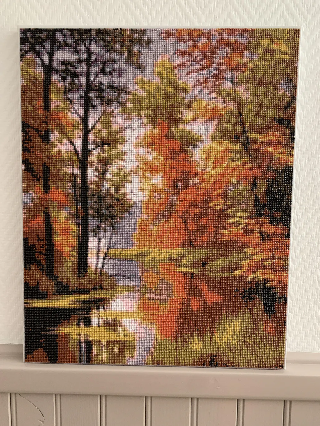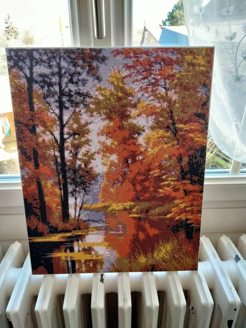 1 lienzo adhesivo de primera calidad, numerado según el motivo a crear y ya montado sobre un bastidor. Una placa de madera en la parte posterior de la lona proporciona una rigidez perfecta para aplicar los diamantes.