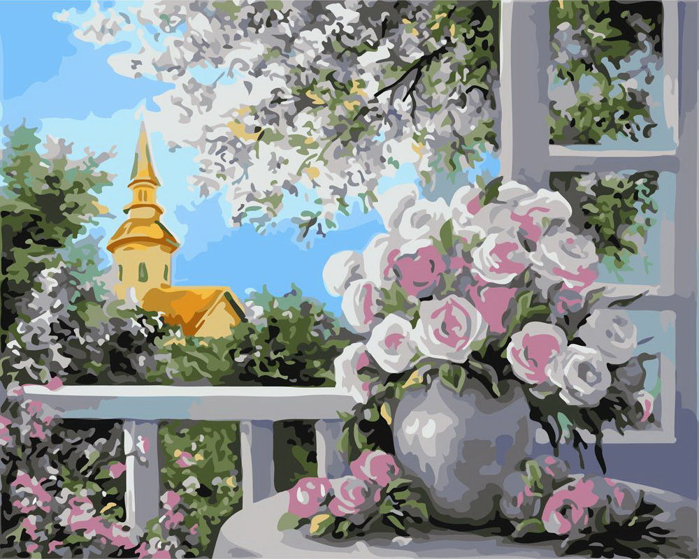 Balcón y jarrón de flores