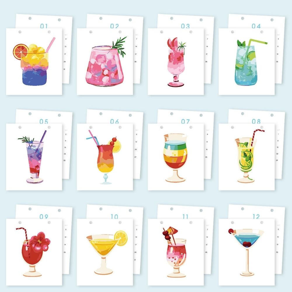 - 12 hojas de calendario con ilustraciones de pintura por números de cócteles