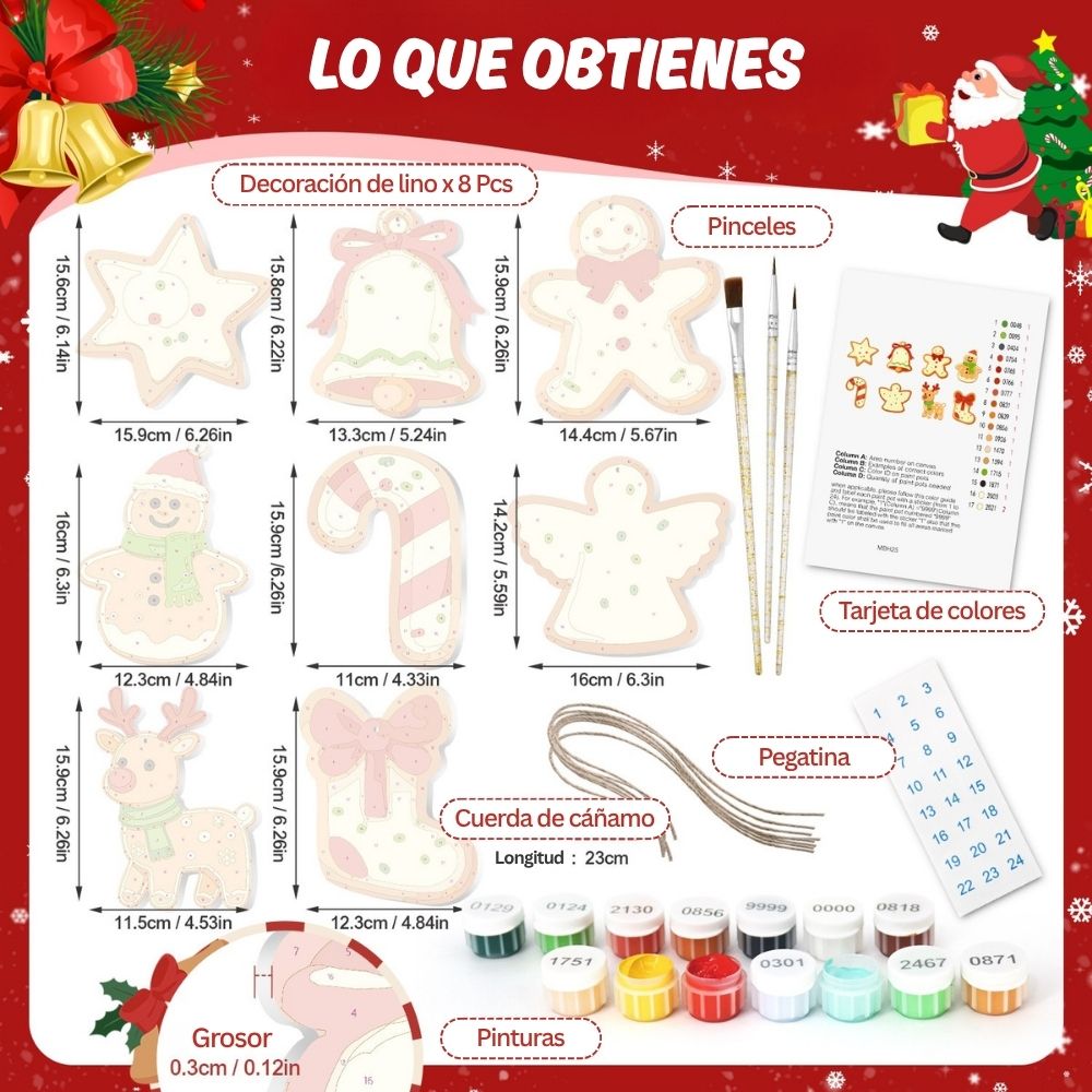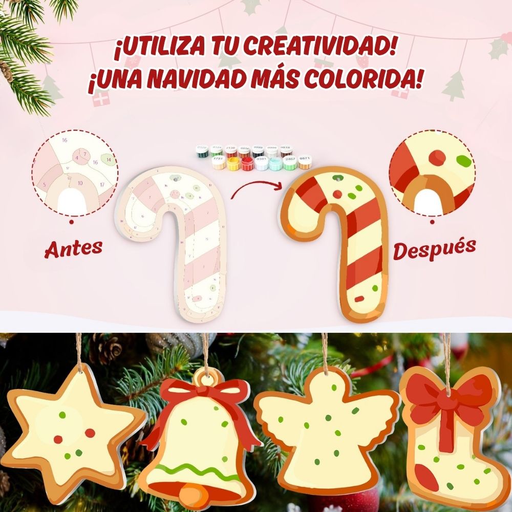 Envuelve tus fiestas de calidez y creatividad con el kit Decoraciones de Navidad para Pintar por Numeros. Este encantador conjunto de adornos de navidad evocan la cálida atmósfera de una tarde de invierno, con aroma a galletas y canela. Cada pieza de madera tiene la forma de los adornos navideños clásicos: hombrecitos de jengibre, casas, estrellas y más, listos para pintar con los cálidos colores navideños. Una forma divertida y creativa de decorar tu árbol con tu toque personal. Cada pieza captura la alegría navideña y la comodidad del invierno, creando un complemento especial para tus decoraciones navideñas. Simplemente sigue los números y observa cómo tus adornos cobran vida con color y encanto.