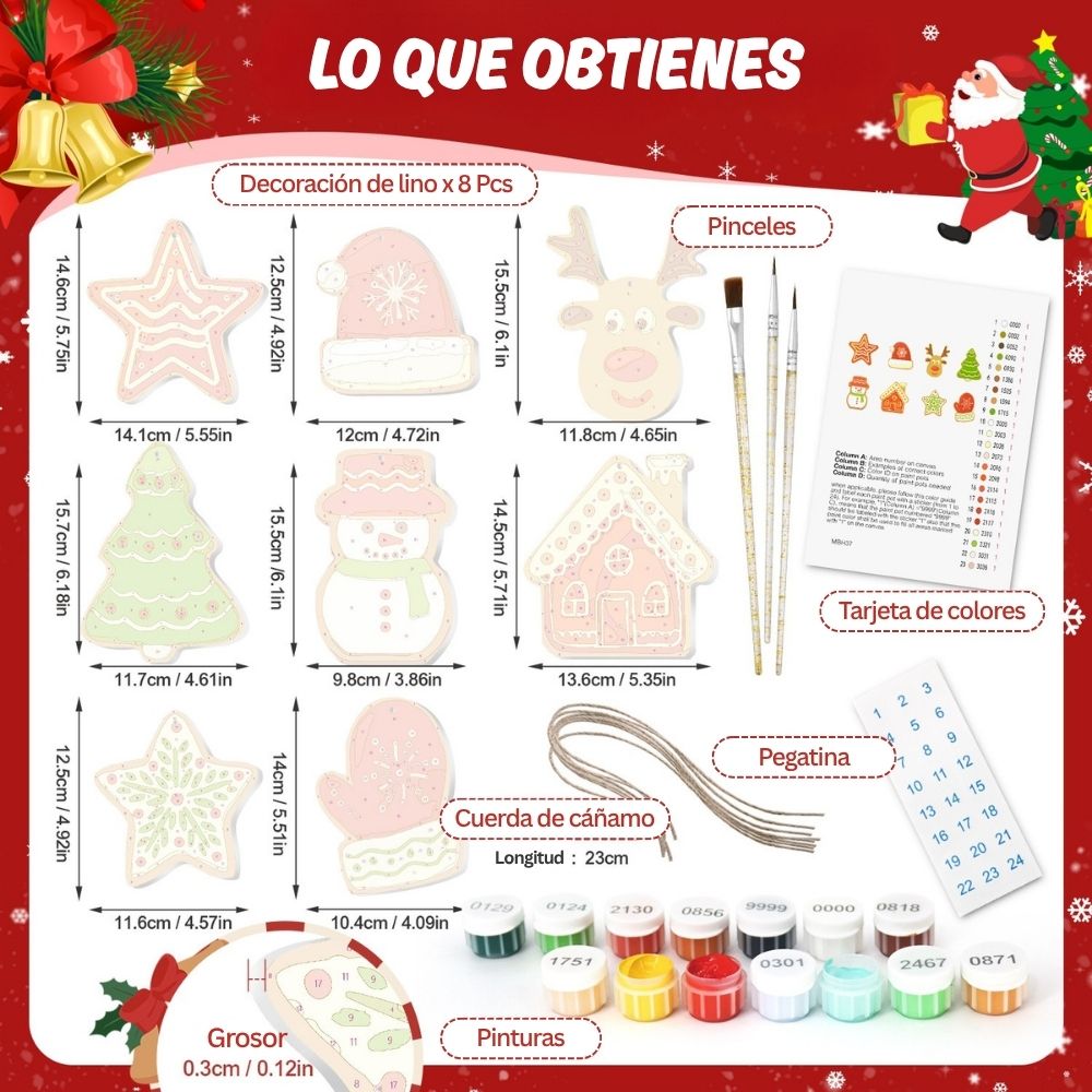 Envuelve tus fiestas de calidez y creatividad con el kit Decoraciones de Navidad para Pintar por Numeros. Este encantador conjunto de adornos de navidad evocan la cálida atmósfera de una tarde de invierno, con aroma a galletas y canela. Cada pieza de madera tiene la forma de los adornos navideños clásicos: hombrecitos de jengibre, casas, estrellas y más, listos para pintar con los cálidos colores navideños. Una forma divertida y creativa de decorar tu árbol con tu toque personal. Cada pieza captura la alegría navideña y la comodidad del invierno, creando un complemento especial para tus decoraciones navideñas. Simplemente sigue los números y observa cómo tus adornos cobran vida con color y encanto.