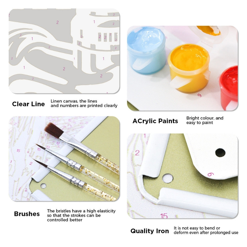 2) Recibirá un kit listo para usar que contiene el lienzo con las áreas numeradas, los potes de pinturas numeradas, pinceles y una imagen del resultado esperado para usar de guía. ¡Que comience el viaje!