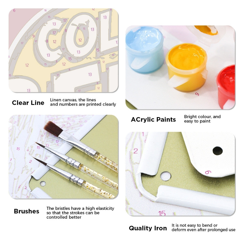 2) Recibirá un kit listo para usar que contiene el lienzo con las áreas numeradas, los potes de pinturas numeradas, pinceles y una imagen del resultado esperado para usar de guía. ¡Que comience el viaje!