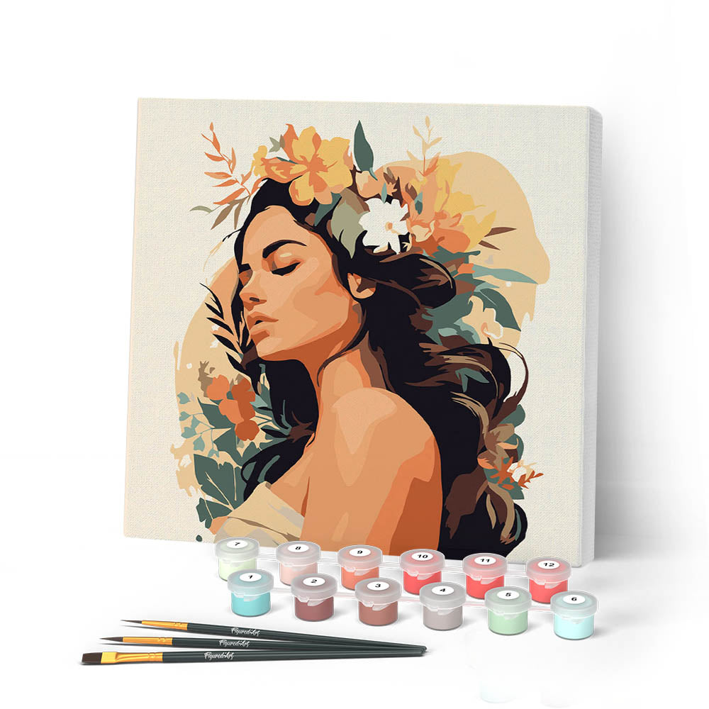 Modelo: Mini Pintura por Números 20x20cm con bastidor - Mujer con diadema floral
