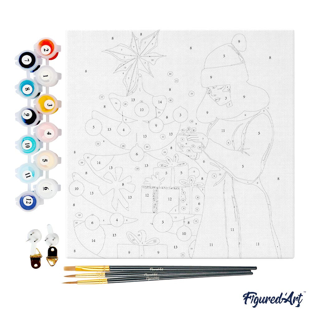 Modelo: Mini Pintura por Números 20x20cm con bastidor - Mujer con árbol de Navidad