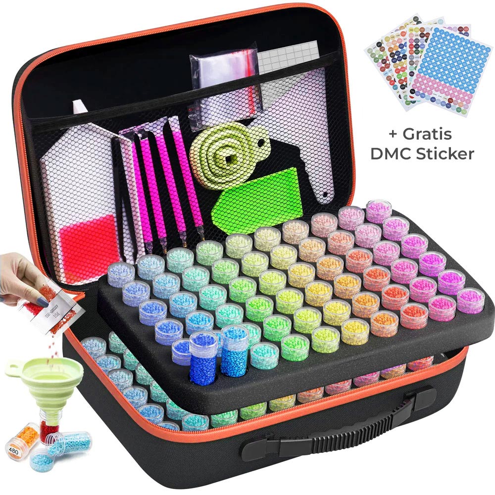 - Incluye: 1x Estuche Único-Diamond / 120x Recipientes Único-Diamond bloqueables individualmente / 1x Etiqueta DMC / 1x Embudo / 1x Tapete / 6x Ceras / 2x Bandejas / 4x Bolígrafos / 4x Multi-tips / 20x Bolsas zip / 1x Pinza de plástico / 1x XL Bandeja / 1x Corrector