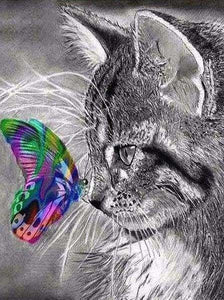Punto de Cruz Diamante - Gato y mariposa colorida