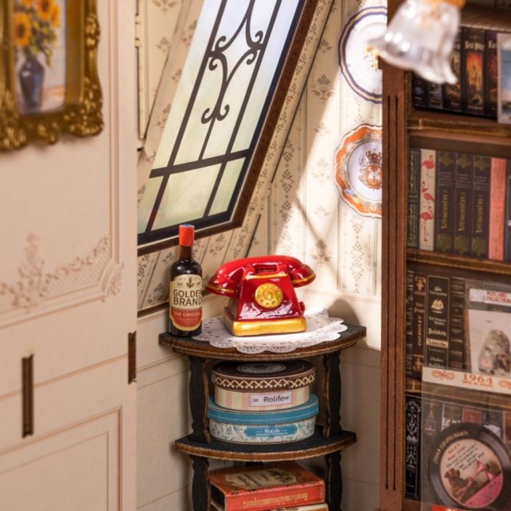 Bienvenido a laSala de estar de Catherine, donde la elegancia y el intelecto se combinan en un espacio acogedor lleno de confort y cultura. Esta refinada escena en miniatura está decorada con ricos tonos de madera, suelos de mosaico detallados y muebles atemporales que reflejan su gusto sofisticado. Un sofá de cuero rojo invita a relajarse con música o una taza de té, mientras que la chimenea y la lámpara de pie crean un ambiente acogedor. El kit incluye iluminación LED que ilumina suavemente toda la habitación, proyectando una luz cálida y ambiental sobre estanterías repletas de libros y objetos especiales. Una encantadora mesa de ajedrez sugiere tardes de estrategia, y la delicada porcelana añade un toque de gracia clásica. Sobre la estantería más alta descansa un recuerdo preciado: un pequeño caballo balancín rojo que aporta un aire nostálgico.