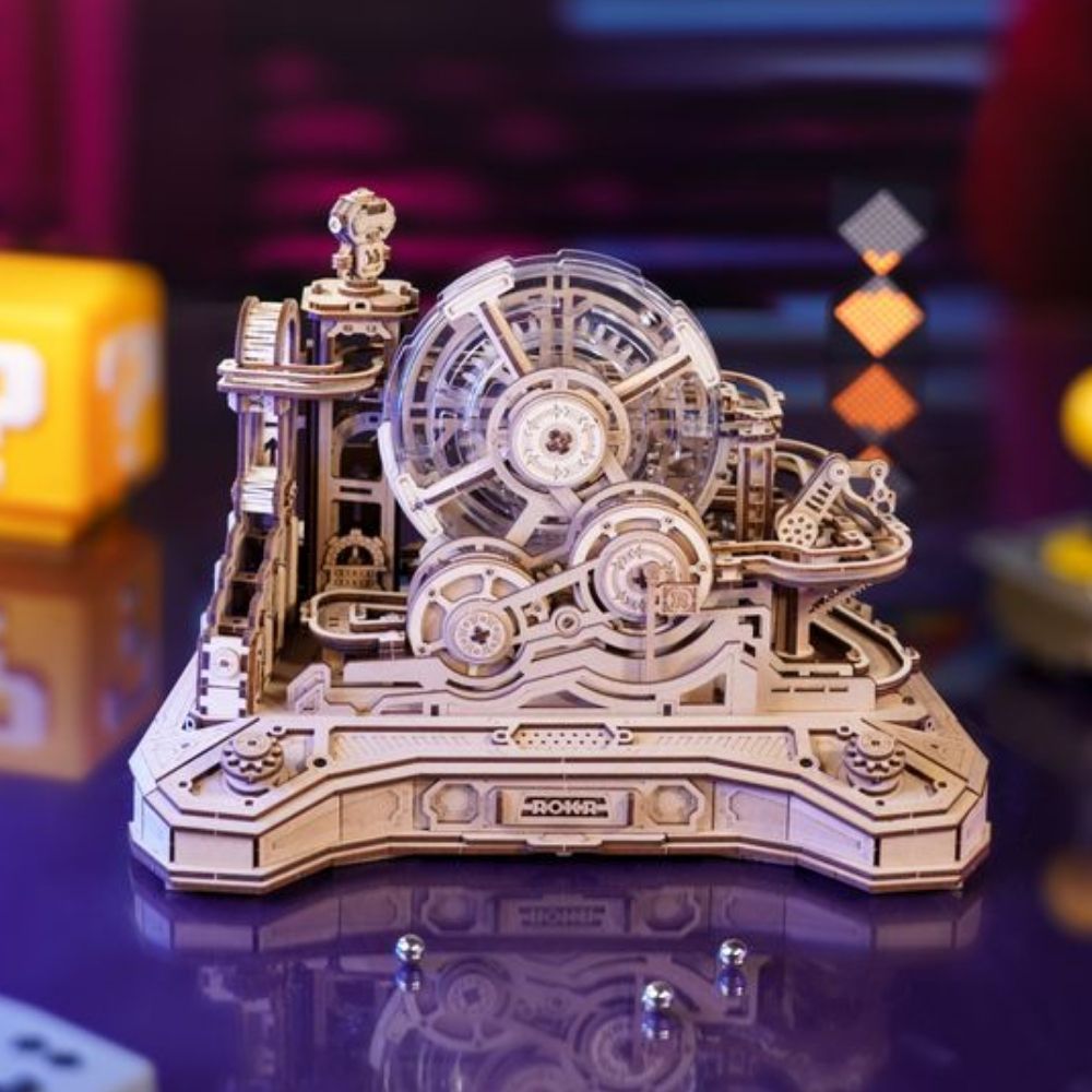 Este puzzle 3D de madera es una pista de canicas mecánica e interactiva que da vida a un desafío con forma de mando de videojuego vintage. Con 653 piezas y seis emocionantes etapas, guiarás bolas metálicas mediante perillas, palancas e interruptores a través de rampas, un anillo aéreo y elevadores automáticos hasta alcanzar la meta, culminando con el sonido victorioso de una campana de cobre. Una experiencia gratificante de construcción y juego que combina resolución de acertijos, movimiento mecánico y diversión práctica, ideal para exhibición y entretenimiento interactivo.