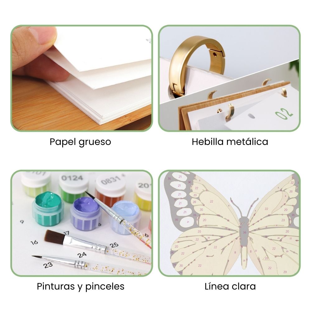 Este calendario trae la belleza delicada de las mariposas a tu planificación diaria. Cada mes presenta una ilustración graciosa de mariposa, lista para ser pintada con colores acrílicos ricos. Desde alas tropicales brillantes hasta patrones pastel suaves, crearás un caleidoscopio de obras de arte a lo largo de los meses.