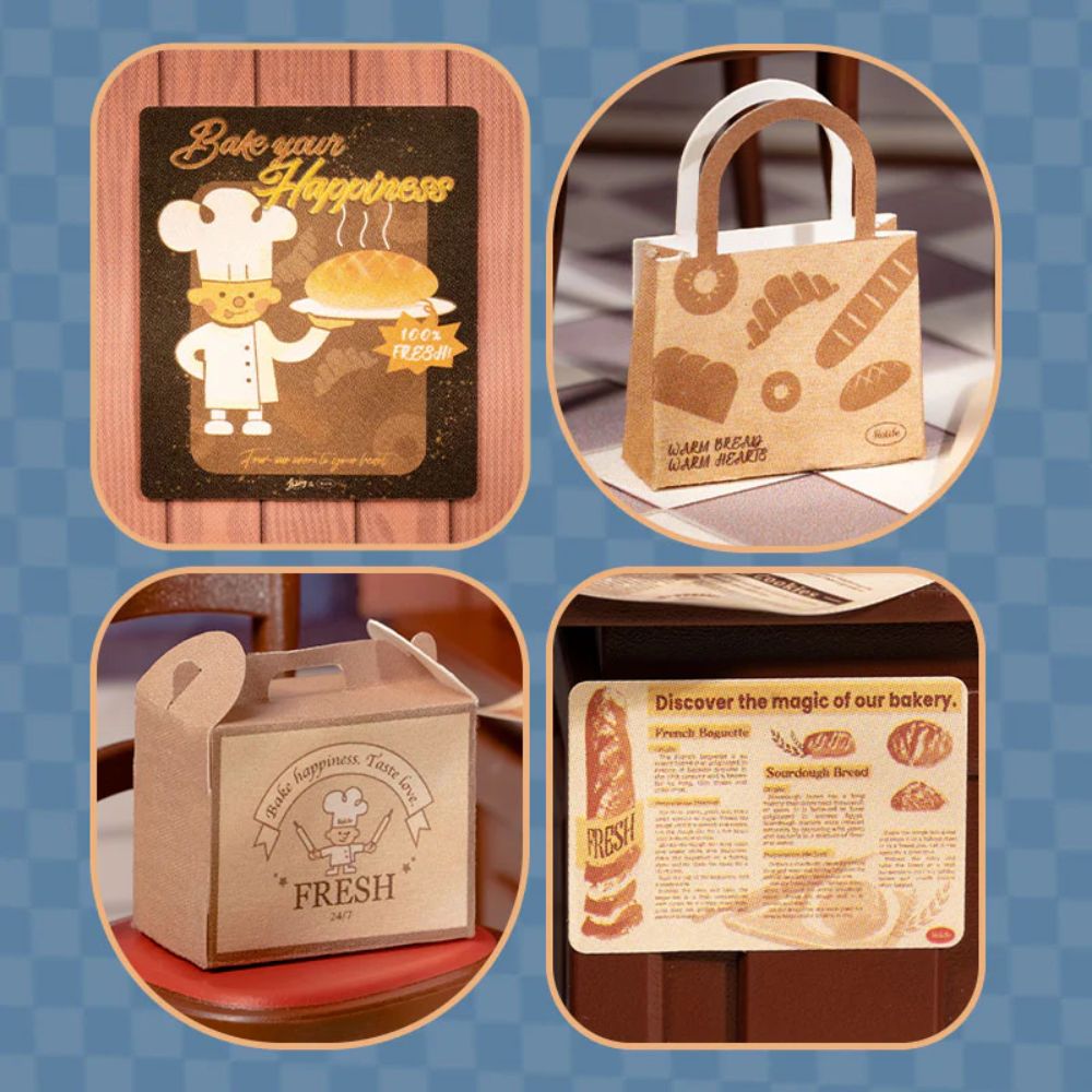 Adéntrate en el irresistible mundo de la Casa panadería de mantequilla, donde el aroma de panes y pasteles recién horneados llena el aire. Panes de masa madre, hogazas crujientes, bagels y croissants se alinean en los mostradores, mientras los dulces, como donuts y tarros de mermelada, aportan un contraste delicioso. Pequeñas cajas para llevar están listas para tus selecciones favoritas, facilitando llevar un pedacito de esta animada tienda a casa. Con precios cuidadosamente exhibidos y un ambiente animado y acogedor, esta panadería en miniatura captura el encanto y la calidez de un favorito del vecindario, invitándote a disfrutar de cada detalle delicioso.