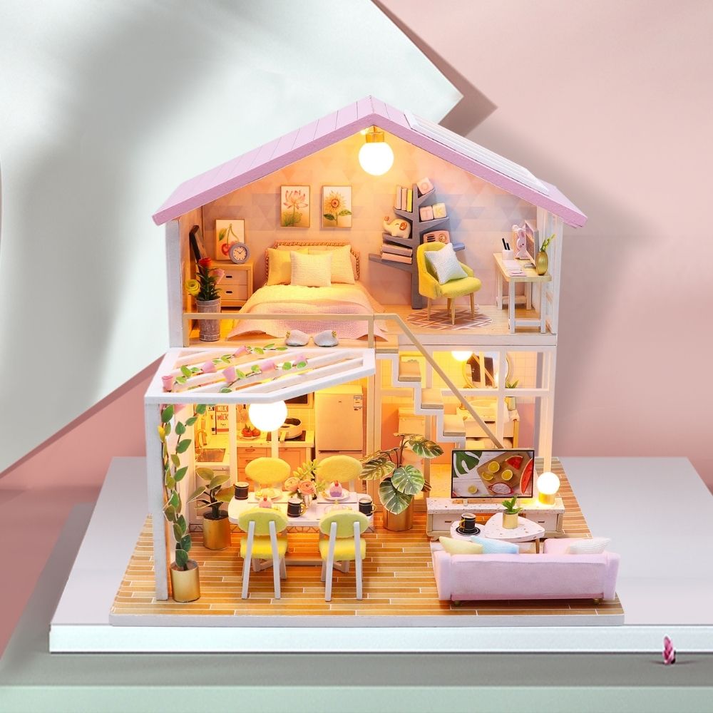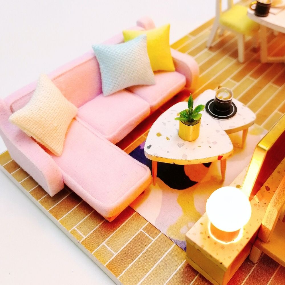 Cálida y suave en tonos rosados, este kit de casa miniatura evoca una vida llena de felicidad y paz. Diseñado con una disposición abierta, el modelo incluye una mesa de comedor, una cocina, un dormitorio, un escritorio con computadora y una biblioteca. Cada rincón está lleno de encanto acogedor, reflejando la calidez de la vida diaria y la comodidad de dormir con una sonrisa.