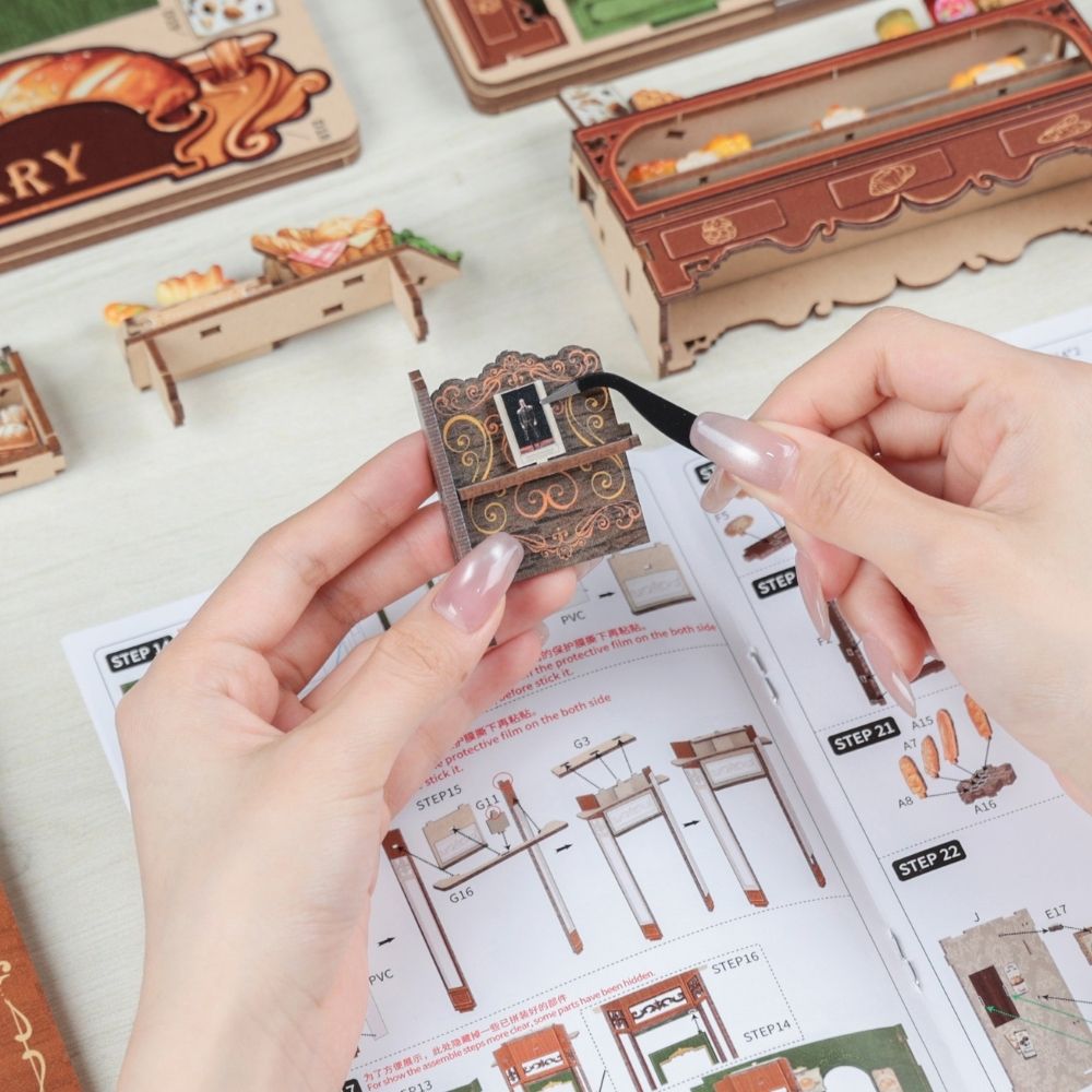 Al abrir el kit, descubrirás todo lo necesario para maqueta de madera sencilla: piezas finamente cortadas, pequeñas decoraciones para ensamblar y detalles de color y textura que te guiarán en la creación de un mundo coherente. Este proceso minucioso pero accesible transforma la actividad creativa en un momento de calma casi meditativo, donde ves nacer poco a poco tu propio pequeño mundo.
