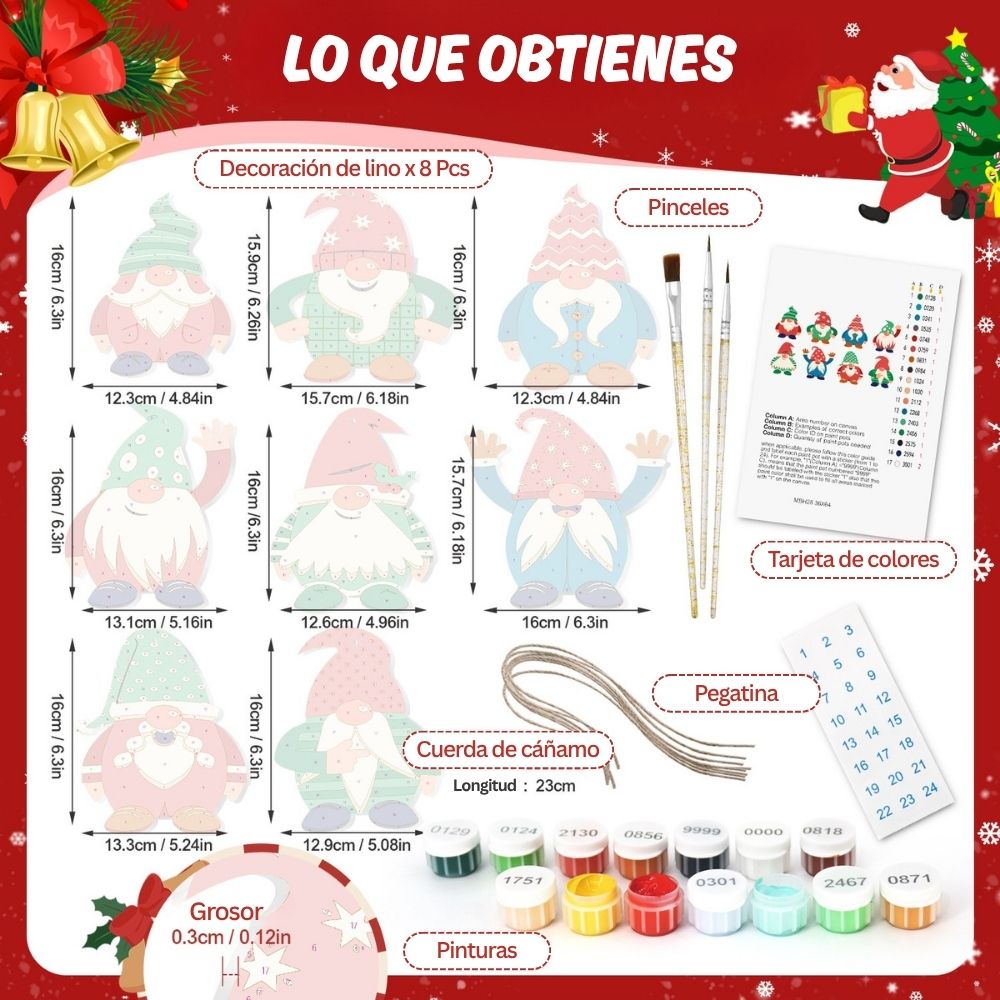 Envuelve tus fiestas de calidez y creatividad con el kit Decoraciones de Navidad para Pintar por Numeros. Este encantador conjunto de adornos de navidad evocan la cálida atmósfera de una tarde de invierno, con aroma a galletas y canela. Cada pieza de madera tiene la forma de los adornos navideños clásicos: hombrecitos de jengibre, casas, estrellas y más, listos para pintar con los cálidos colores navideños. Una forma divertida y creativa de decorar tu árbol con tu toque personal. Cada pieza captura la alegría navideña y la comodidad del invierno, creando un complemento especial para tus decoraciones navideñas. Simplemente sigue los números y observa cómo tus adornos cobran vida con color y encanto.