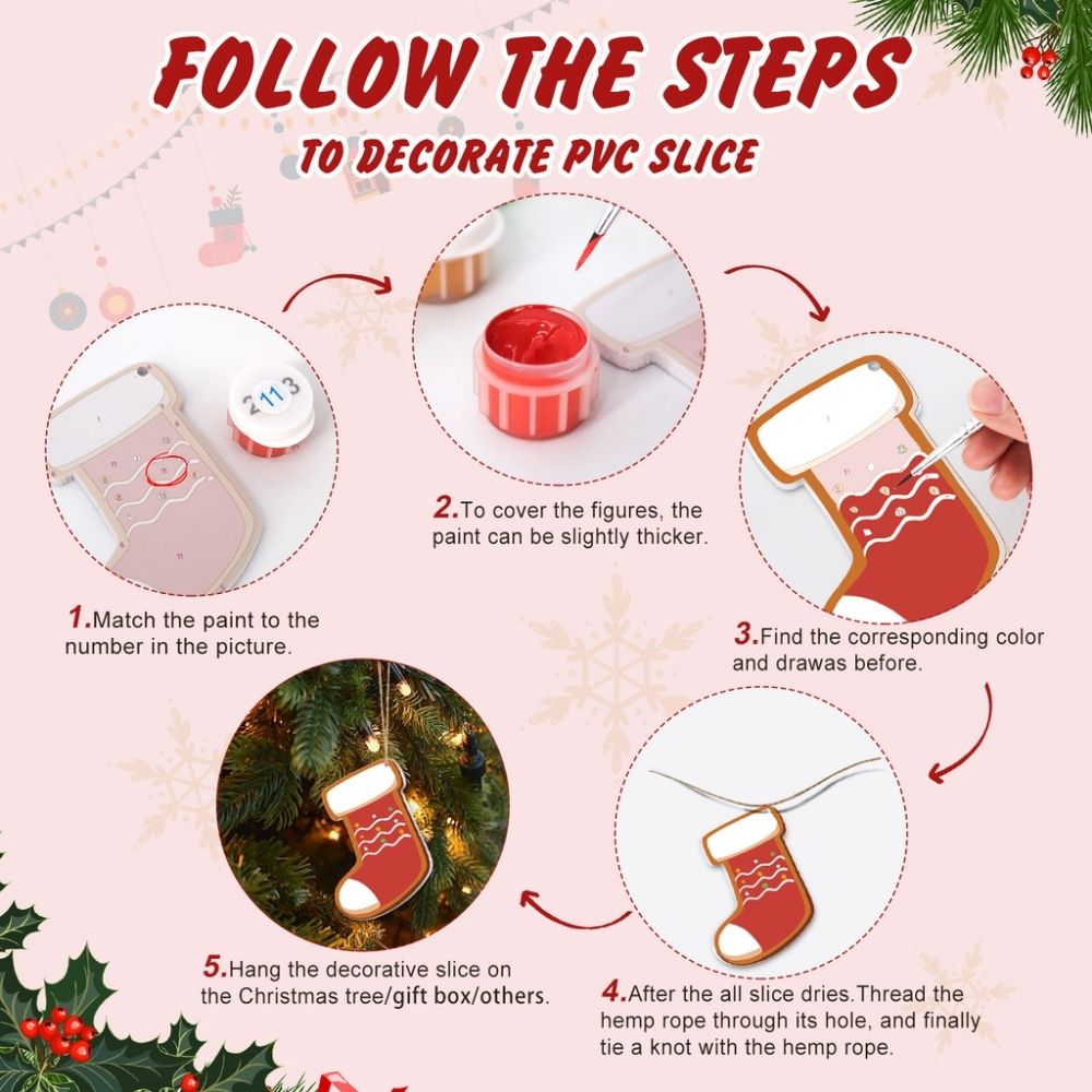 • 8 adornos de madera pre-cortados con diseños numerados impresos