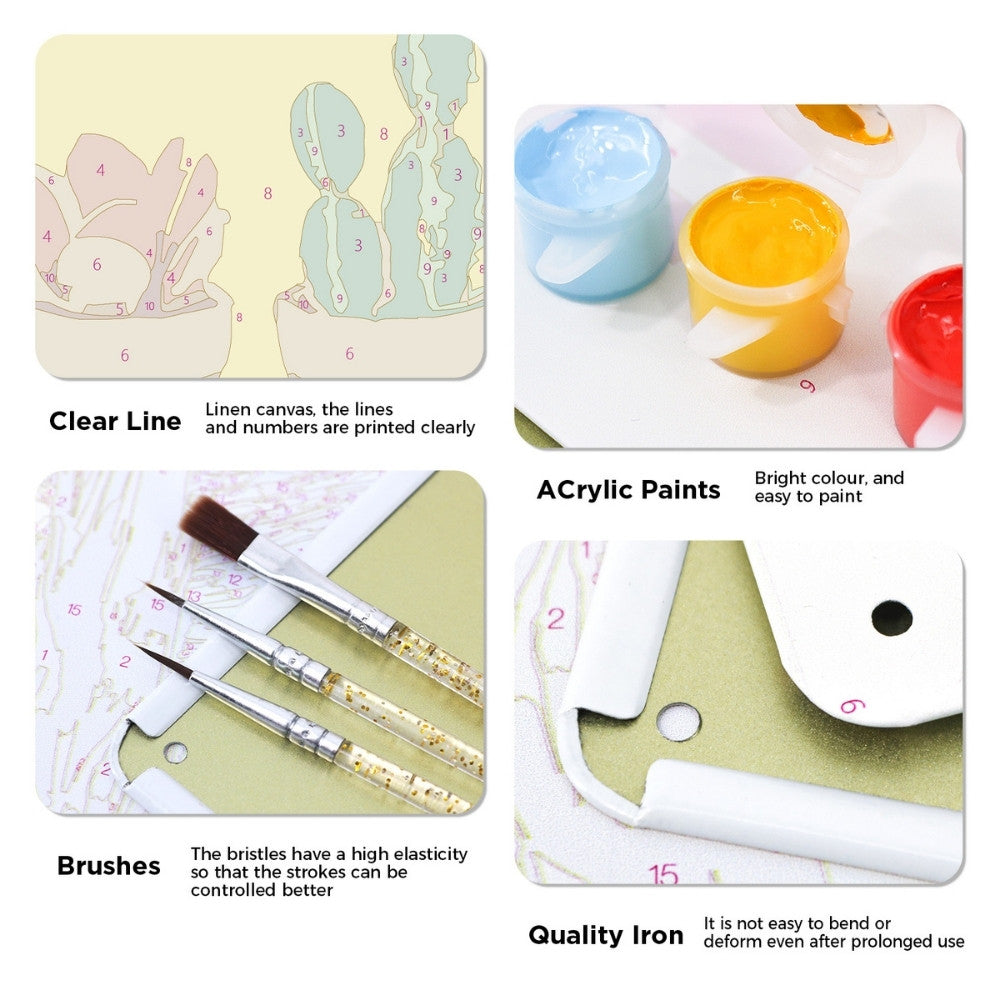 2) Recibirá un kit listo para usar que contiene el lienzo con las áreas numeradas, los potes de pinturas numeradas, pinceles y una imagen del resultado esperado para usar de guía. ¡Que comience el viaje!