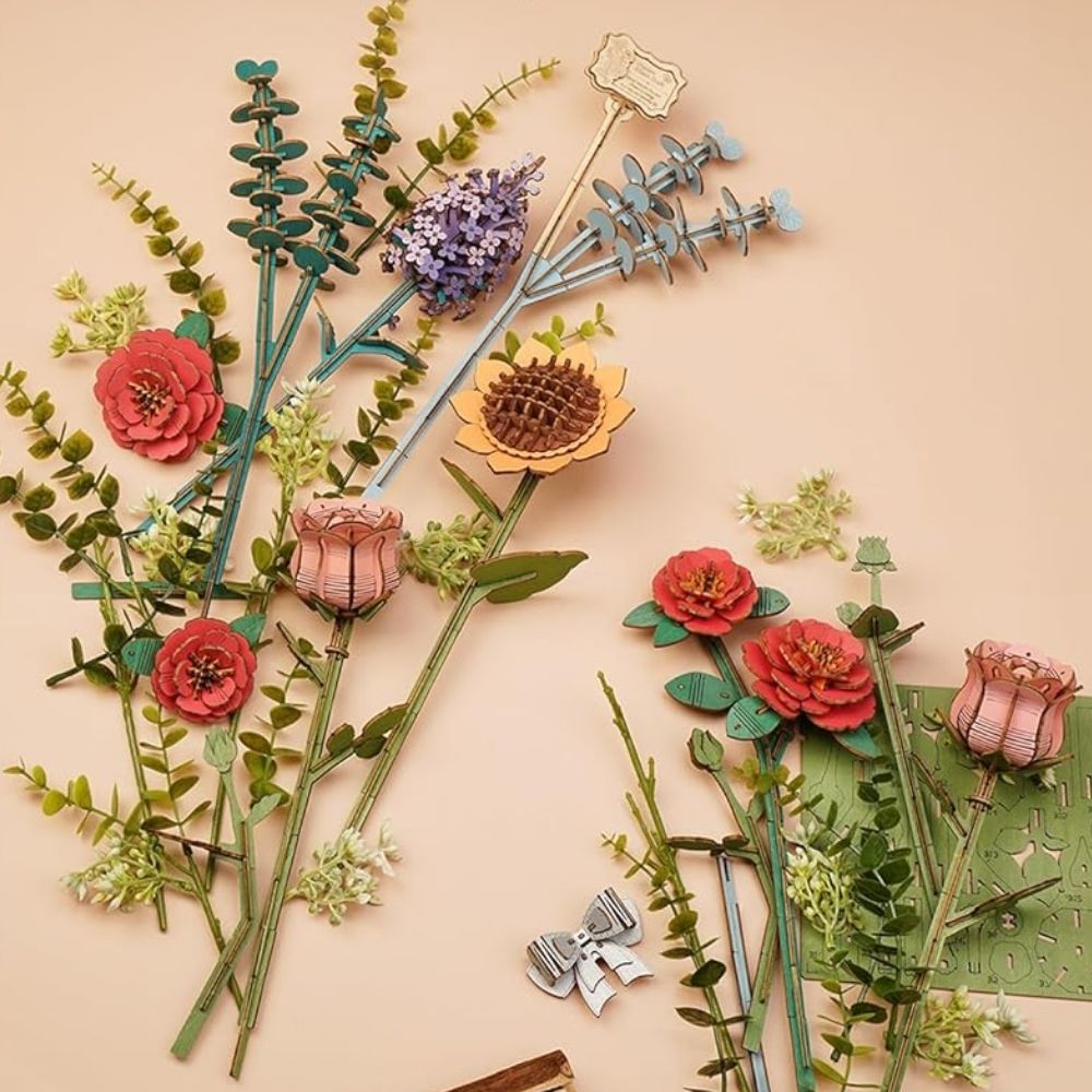 - Diseño Floral: Incluye flores de madera cortadas con láser como rosas, peonías y girasoles.