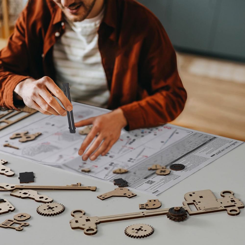 - Materiales: Hecho de madera cortada con láser, asegurando precisión y durabilidad.